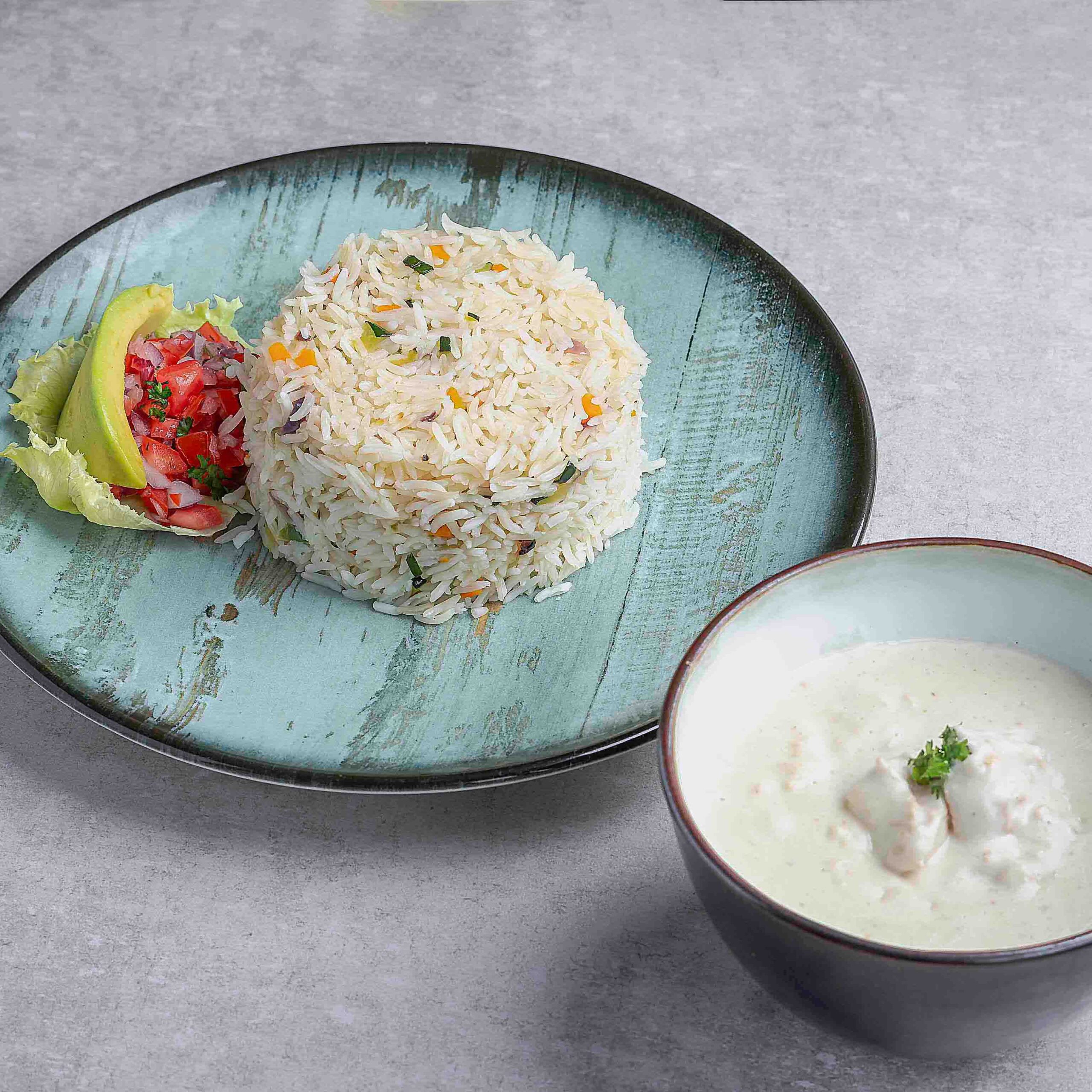 (BONELESS CUBED CHICKEN IN GRAVY MADE OF FRESH CREAM, CASHEW NUTS, COCONUT AND HERBS SERVED WITH A SIDE OF CHOICE)