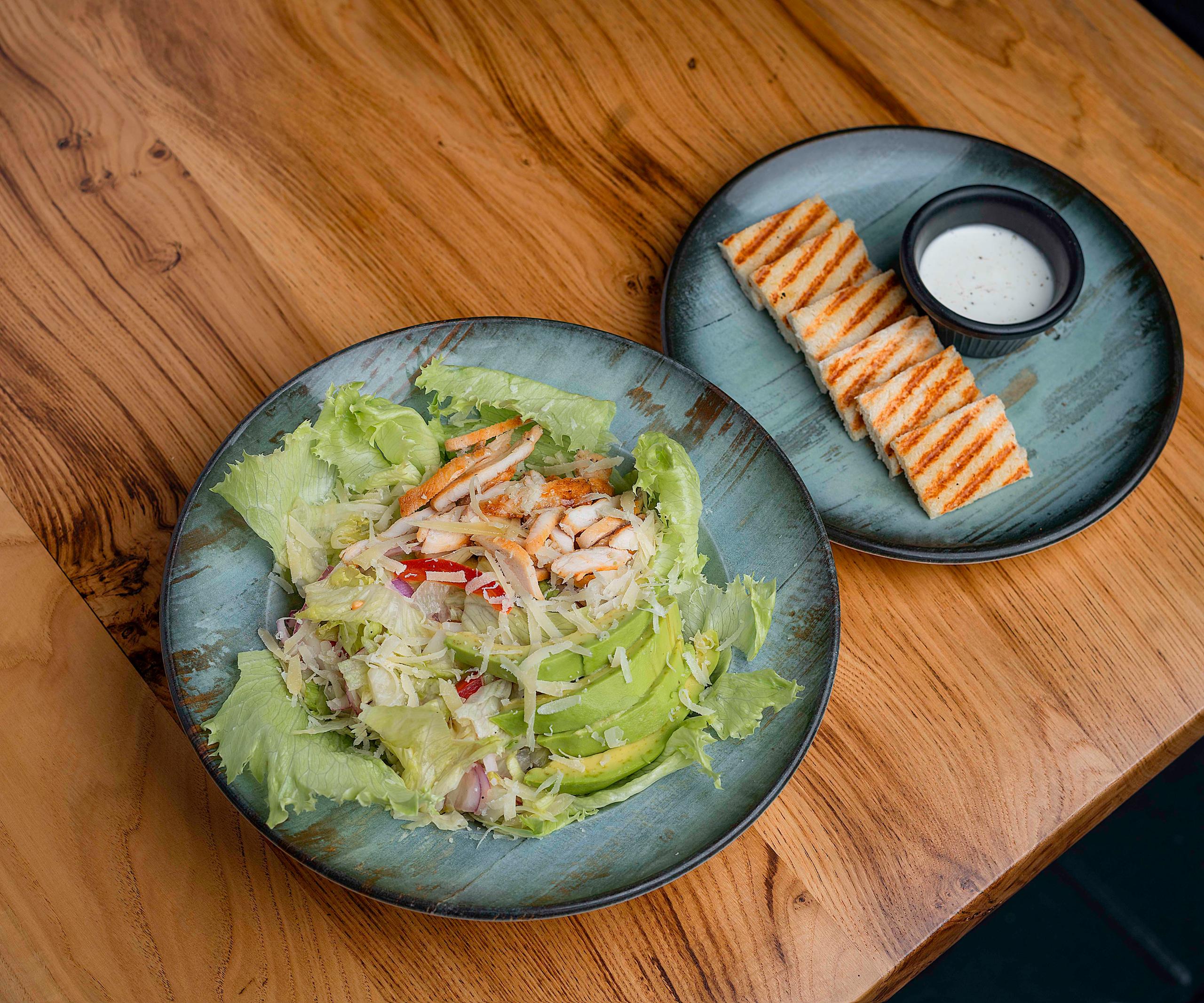 (GRILLED CHICKEN FILLET SERVED ON A BED OF FRESH LETTUCE. PARMESAN CHEESE. CRUNCHY CROUTONS. AVOCADO AND A CLASSIC CAESAR DRESSING)