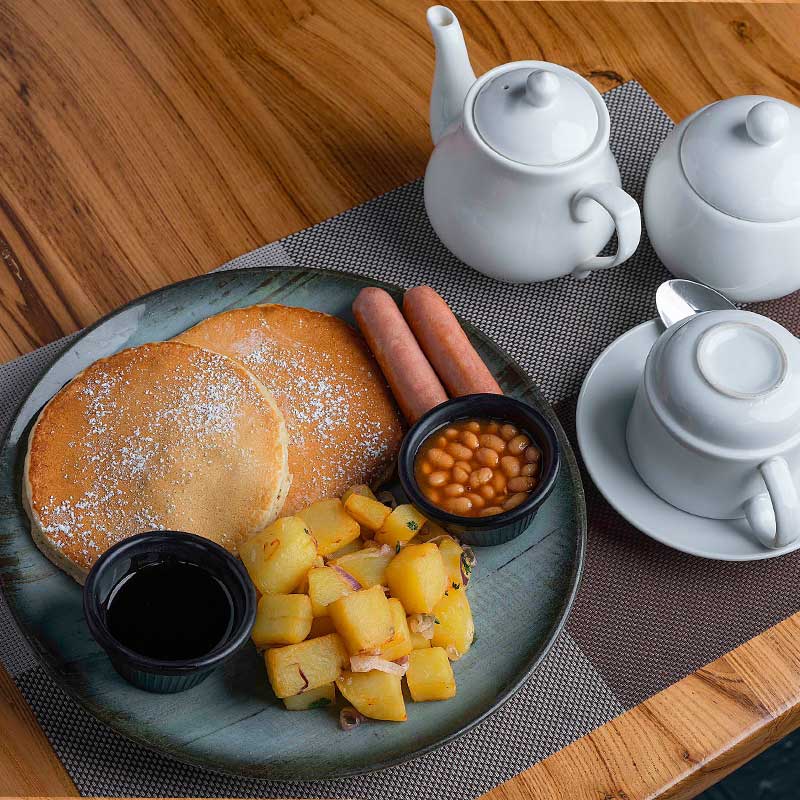 (2 fluffy american pancakes served with 2 beef sausages, breakfast potatoes and baked beans served with marple syrup.)