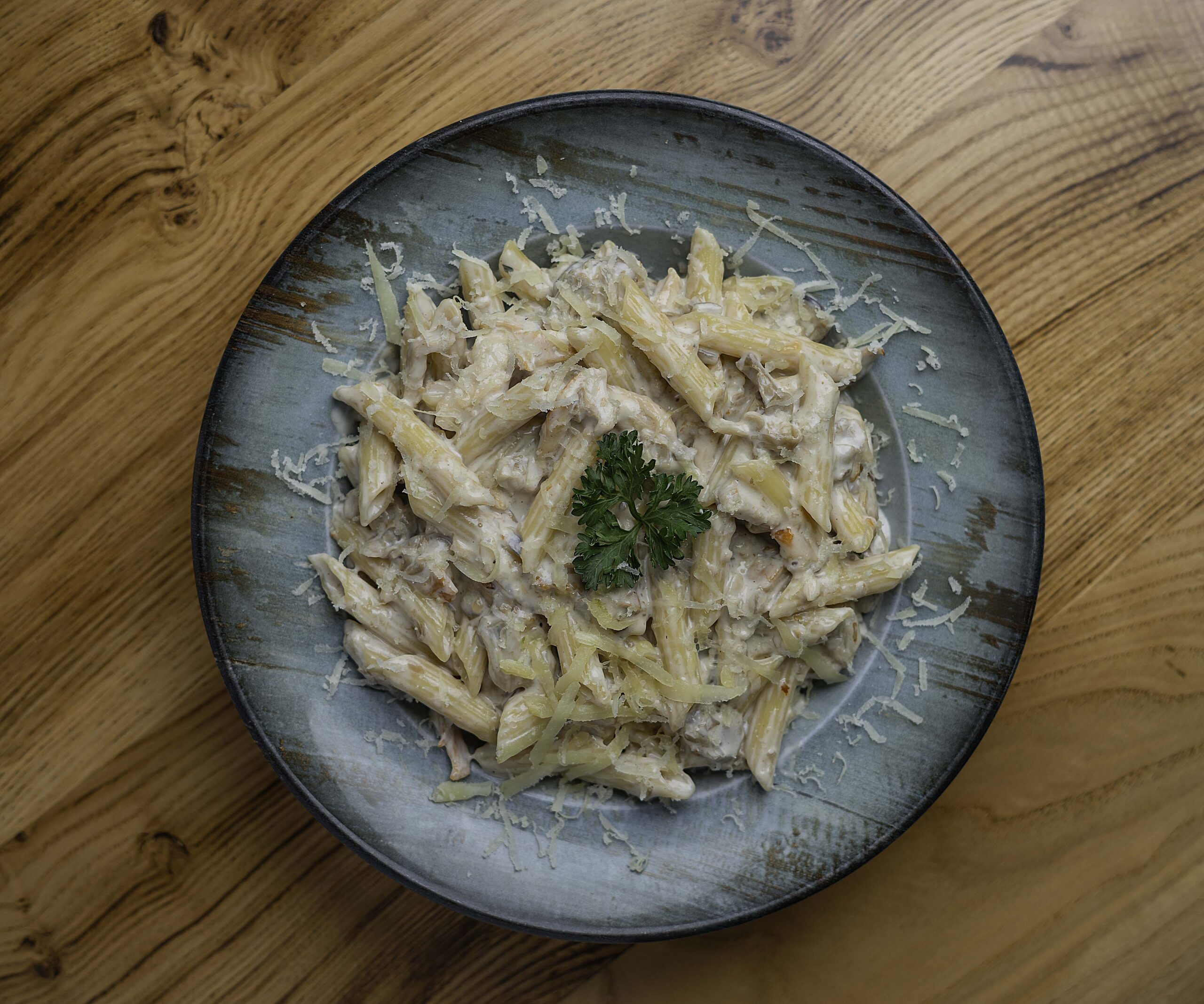 PENNE MIXED WITH WHITE CREAMY SAUCE WITH CHICKEN AND MUSHROOMS AND AN OPTIONAL CHEESE TOPPING
